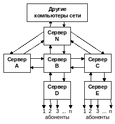 Структура сети такова, что каждый сервер имеет по отношению к себе вышестоящий сервер, с которым и обменивается информацией. Так, серверы D и Е обмениваются информацией с серверами Б и С. Серверы А, В, С обмениваются информацией с сервером N. Сервер же N имеет шлюз в мировое содружество сетей, включая наиболее распространенные в России сети: Relcorn, GlasNet и др.