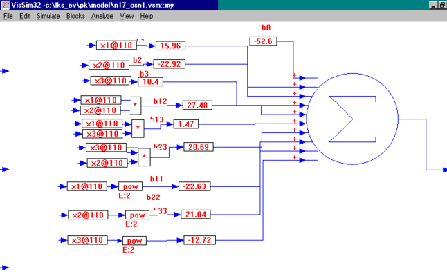 Полученные коэффициенты подставим в уравнение регрессии и построим схему для проведения эксперимента (приложение №2,3 Vissim 32) и проведем эксперимент без использования дельты или шума.