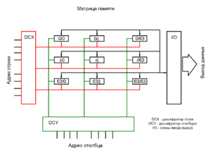 Микросхемы большой информационной ёмкости реализуют в виде матриц, запоминающие элементы расположены в узлах матрицы. Каждый элемент связан с одной вертикальной и одной горизонтальной адресными шинами.