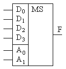Мультиплексор – (рис В) комбинационное цифровое устройство, которое обеспечивает передачу на единственный выход F одного из нескольких входных сигналов Dj в соответствии с поступающим адресным кодом Ai. При наличии n адресных входов можно реализовать M=2n комбинаций адресных сигналов, каждая из которых обеспечивает выбор одного из M входов. Чаще всего используются мультиплексоры «из 4 в 1» (n=2, M=4), «из 8 в 1» (n=3, M=8), «из 16 в 1» (n=4, M=16). Правило работы мультиплексора «из 4 в 1» можно задать таблицей истинности: