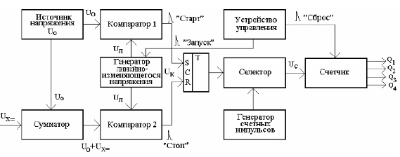 В АЦП, реализующих времяимпульсный метод преобразования, измеряемая величина (в данном случае UХ=) предварительно преобразуется в пропорциональный ей интервал времени путем сравнения со значением известной величины, изменяющейся по определенному закону. Затем полученный интервал времени (также аналоговая величина) непосредственно преобразуется в цифровой код. Таким образом, преобразователи, реализующие этот метод, должны быть отнесены к средствам измерения прямого преобразования. Среди них встречаются как преобразователи мгновенного значения, так и преобразователи с аналоговым интегрированием и усреднением результатов преобразования.