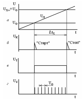Тактовый импульс УУ сбрасывает на нуль показания счетчика, полученные во время предыдущего такта, и запускает генератор линейно изменяющегося напряжения Uл (ГЛИН), с которым и осуществляется сравнение UХ= при преобразовании его во временной интервал (рисунок 4.12,а). Это сравнение производится в сравнивающих устройствах - компараторах К1 и К2, причем компаратор К1 имеет уровень срабатывания U0, а компаратор К2 - уровень срабатывания UХ=+ U0. При UЛ = U0 срабатывает К1 и образуется старт - импульс (рисунок 4.12,б), который открывает селектор. С этого момента времени начинается подсчет счетчиком импульсов, поступающих через открытый селектор от генератора счетных импульсов (ГСчИ). Импульсы следуют с периодом T0, определяющим шаг квантования в данной схеме (рисунок 4.12,г). Подсчет их продолжается до тех пор, пока UЛ не возрастет до значения UЛ = UХ= + U0. В этот момент времени срабатывает компаратор К2 и образуется стоп-импульс (рисунок 4.12,б), который закрывает селектор.