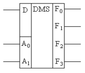 Демультиплексор выполняет функцию, обратную мультиплексору, т.е. в соответствии с принятой адресацией Ai направляет информацию с единственного входа D на один из M выходов Fj. При этом на остальных выходах будут логические нули (единицы). Принцип работы демультиплексора «из 1 в 4» иллюстрируется таблицей истинности: