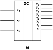 Дешифратор (рис А) – это устройство, предназначенное для преобразования двоичного кода в напряжение логической единицы (логического нуля) на том выходе, номер которого совпадает со значением двоичного кода на входе. При n входах в полном дешифраторе имеется 2n выходов, т.е. для каждой комбинации входных сигналов имеется соответствующий выход. Дешифратор, у которого при n входах число выходов меньше 2n, называется неполным. Другое название дешифратора - декодер. Принцип работы полного трехразрядного дешифратора рассмотрим на примере его таблицы истинности.