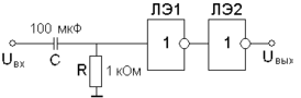 1. Изобразить временные диаграммы входного и выходного напряжений схемы, представленной на рисунке, а также напряжений на входах логических элементов ЛЭ1 и ЛЭ2 при воздействии на вход схемы прямоугольного импульса с амплитудой, равной напряжению питания схемы и найти величину задержки переднего фронта. Логические элементы ЛЭ1 и ЛЭ2 КМОП-типа.