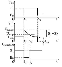 . В момент t1 на вход подается положительный перепад напряжения, равный (E1-E0)