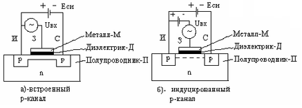 Полевые транзисторы с изолированным затвором (ПТИЗы) бывают двух типов: с встроенным каналом и с индуцируемым каналом, рассмотрим их физические модели (рис.26)