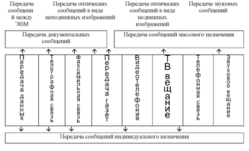 Условная классификация современных видов электросвязи показана на Рис. 3.6. Все виды электросвязи по типу передаваемых сообщений могут быть разделены на предназначенные для передачи звуковых сообщений, оптических сообщений в виде подвижных изображений, оптических сообщений в виде неподвижных изображений и сообщений между ЭВМ. В зависимости от назначения сообщений виды электросвязи могут быть разделены на предназначенные для передачи сообщений индивидуального и массового характера.