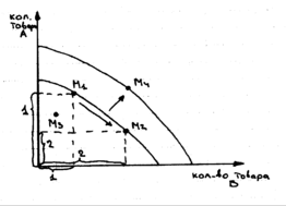 Комментарии к графику: каждая точка – это комбинация товара А и В, когда все ресурсы задействованы. Переход от М1 к М2 – уменьшаем производство А и увеличиваем В. Вариант М4 невозможен при имеющихся ресурсах. М3 –возможен, но неэффективное (неполное) использование ресурсов. М4 возможен при изменении технологии производства и увеличении факторов производства, в этом случае КПВ смещается вправо вверх.