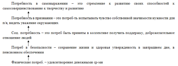 1. Абрхам Маслоу выделяет 5 иерархических уровней потребностей. Удовлетворение потребностей нижнего уровня приводит к активизации потребностей более высокого уровня. Так, например, у сытого человека, который ощущает себя в безопасности, появляются социальные потребности (потребность в общении, любви и т. п.). Удовлетворение потребностей в общении с желаемой социальной группой расширяет возможности появления и нахождения способов удовлетворения потребности в уважении и т. д. Поэтому процесс мотивации через потребности является бесконечным.