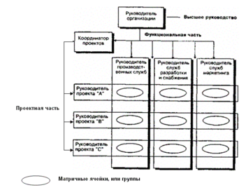Матричные организации создаются, когда выбранная стратегия делает упор на получение высококачественного результата по большому количеству проектов в области высоких технологий, а сама работа представляется очень сложной и недостатки, порождаемые использованием групп, перевешивают преимущества. Матричная департаментизация всегда является комбинацией двух организационных альтернатив, обычно — функциональной и продуктовой (проектной). Таким образом, появляются две формальные схемы структур в матричной организации (рис.). Основной задачей руководства в этих условиях становится поддержание баланса между двумя структурами.