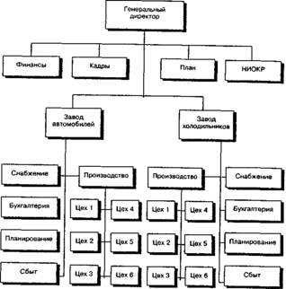 Решение проблем, возникающих в организации, построенной по линейно-функциональной схеме, было найдено в конце 20-х гг. с появлением первых дивизиональных (или отделенческих) схем организационной структуры на предприятиях «Дженерал Моторс». Руководство этого автомобильного гиганта и, в частности, ее новый президент Альфред Слоун, отдавали себе отчет в том, что в штаб-квартире невозможно, подстраиваясь под конъюнктуру рынка, эффективно принимать все решения относительно деятельности многочисленных производственных линий по выпуску машин. Чтобы решить эту проблему, каждому подразделению по выпуску машин было определено место, которое оно должно было занять на рынке продукции. Руководство компании обратилось с просьбой ко всем управляющим подразделениями разработать планы прибыльных операций, превратив их, таким образом, в «центры прибыли». Сочетание централизованного планирования наверху и децентрализованной деятельности производственных подразделений способствовало образованию дивизиональных организаций.