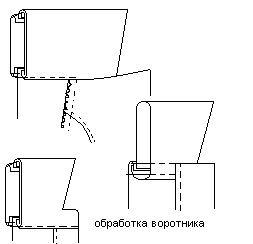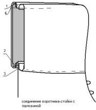 Край стойки воротника между плечевыми швами подгибают внутрь и настрачивают на расстоянии 1-2 мм от края.