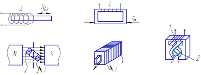 Рис. 1а – принципиальная схема индуктивного преобразователя с ферромагнитным сердечником. Индуктивность L зависит от положения сердечника, что и является входной величиной датчика. Преобразователи, выходная величина которых зависит от внешнего магнитного поля, называются магнитомодуляционными.