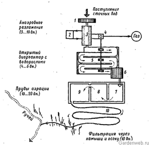 Первая серия прудов предназначена для осаждения сточных вод. На этой стадии в ходе анаэробных процессов разложения образуется биогаз (смесь метана, диоксида углерода, аммиака и других газов). Биогаз является вполне пригодным топливом для двигателей и газовых плит. Биогаз, уходящий в атмосферу, загрязняет воздух и способствует «парниковому эффекту» (нагревание! атмосферы земли, способное изменить климат планеты). Исходя из этих соображений, биогаз, образующийся при первичном разложении сточных вод, следует собирать и использовать.