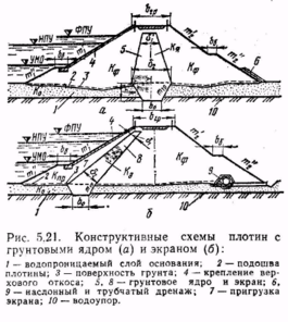 Грунтовое ядро. Ядро относительно оси плотины размещают по следующим схемам (рис. 5.21). Смещая ядро в сторону верхнего бьефа или делая его наклонным, можно повысить устойчивость низового откоса в связи с уменьшением фильтрационной силы и увеличением объема сухого грунта, для которого сдвиговые характеристики будут больше. Верх ядра располагают выше ФПУ, чтобы исключить перелив воды через него; одновременно должно быть обеспечено расстояние от гребня плотины до верха ядра больше глубины промерзания.