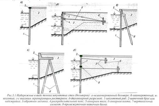 Причальные сооружения в виде тонких стенок называемые часто больверками являются наиболее экономичными и наименее чувствительными к перегрузкам из всех известных конструкций и применяются для строительства набережных практически любой высоты в тех случая, когда грунты основания допускают погружение шпунта и свай на необходимую глубину. В общем случае набережная типа больверк включает свайный или шпунтовый ряд воспринимающий распор грунта и омоноличенный поверху шапочной балкой, анкерные устройства той или иной конструкции, обеспечивающие устойчивость шпунтового ряда, и разгрузочные устройства, уменьшающие горизонтальное давление грунта на шпунтовый ряд.