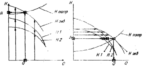 Имеется хар-ка насоса Н=f(Q). Насосная установка имеет всасыв-й (Т1) и напорный (Т2) трубопроводы. По извест. ур-ям строятся кривые потребного напора для всего трубопровода и для всасыв-го труб-да. Для реш-я з-чи необходимо иметь кривую допускаемой вакуум—й высотой всасыв-я- Ндопвак=f(Q). Условие безкавит-й р-ты н-са явл-ся: Ндопвак>Нвак, где Ндопвак-допускаемая вукуум-я высота всасывания. Нвак=Z1+Нт1. т. А-рабоч-я точка. Определяет параметры р-ты насоса. В дан случае подача н-са достижима по условиям всасыв-я, тк на подаче QА Ндопвак>Ндопвак т. А правее т. К1. при изменившихся условиях напорная хар-ка н-са Н=f(Q) искажается и имеет вид пунктирной линии.