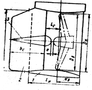 2) Поворотные насадки, как и рули, предназначены для обеспечения управляемости судна. Наиболее эффективными являются одиночные поворотные направляющие насадки, устанавливаемые на одновинтовых судах, и с раздельным управлением (раздельные), перекладываемые независимо одна от другой, используемые на двухвинтовых судах. Поворотная направляющая насадка состоит из собственно насадки 1, стабилизатора 2 и пропульсивной наделки 3. Она имеет в продольных сечениях форму обтекаемого профиля и охватывает с минимальным зазором лопасти гребного вита. Продольный профиль насадки обращен к гребному винту выпуклой поверхностью, которая образует кольцо диаметром Dh. Зазор между концами лопастей и телом насадки делается возможно малым - не более 0,5 % от диаметра Db гребного винта.