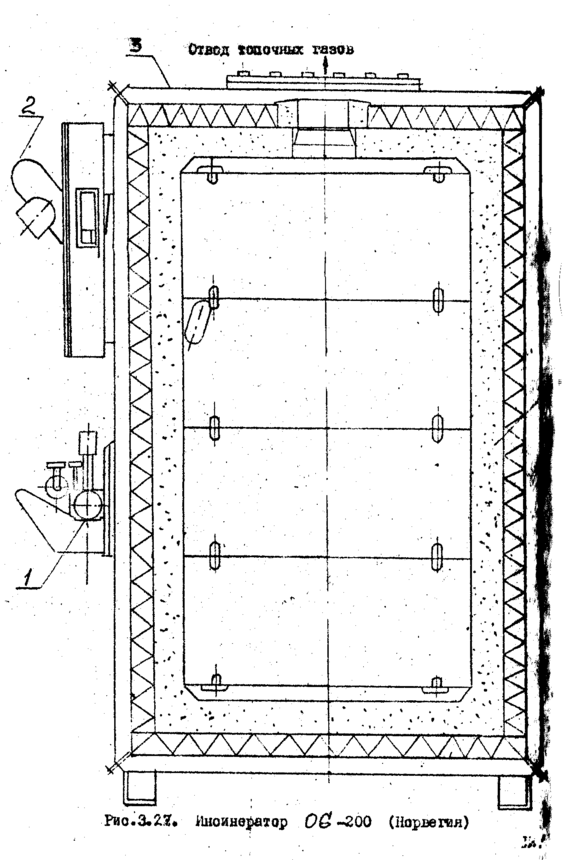 Корпус 3 инсинератора 0G-200, представленный на рис. 3.27 имеет прямоугольную форму, внутри вертикально расположена цилиндрическая камера сгорания 4. На передней стенке имеется дверца со смотровым стеклом и замком, предназначенная для загрузки твердых отходов (замок дверцы откроется лишь тогда, когда температура внутри камеры сгорания будет ниже 100°С), а также дверца для удаления золы. На левой стенке размещены щит управления и питания, топочное устройство и дозирующее устройство жидких отходов 1. Топочное устройство 2 состоит из вентилятора, насоса дизельного топлива, приводного электродвигателя, двух дизельных форсунок с механическим распиливанием, которые способны пропускать топливные включения размером до 8мм, и электрозапального устройства дизельной форсунки.