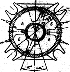 3) Лопастной рулевой привод является исполнительной частью электрогидравлической рулевой машины РЭГ-ОВИМУ-7. Принцип действия привода заключается в следующем. Ротор привода поворачивается по часовой стрелке при подаче рабочей жидкости в полости А, а полости Б при этом будут сливными. Противоположное поворачивание ротора достигается подачей рабочей жидкости в полости Б. Рулевой привод рассчитан на работу при номинальном давлении жидкости 3,5 МПа, крутящий момент при этом давлении составляет 70 кНм.