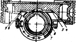 Их выпускают в одинарном и сдвоенном исполнении типен РГ и 2РГ на крутящие моментм2,5-80 кН. м. Особенность \ устройства заключается в объединении двух соосных цилиндров в один цилиндр, названный моментным, с общ; м двусторонним плунжером 5. Последний по обоим концам уплотнен манжетами 4, а в остальной его части по длине, сделан вырез 8, в котором нарезала ьС чатая рейка 9 для сцепления с шестерней 6, насаженной па шпонке на баллер 7 рулевого органа* Сверху и снизу исполнительный механизм закрывается крышками с уплогиительными манжетами. Номинальное рабочее давление масла в этих машинах составляет 6,5-8,5 МПа. Преимуществом рулевых машин с плунжерно-реечным приводом являются малые габаритные размеры и масса.