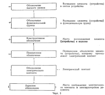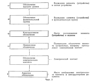 Предшествующие условные обозначения (слева или сверху) должны указывать на последовательное вхождение данного объекта в объекты соответствующих типов. Адресное обозначение, стоящее оправа (или снизу) от условного обозначения объекта, указывает на место изображения (описания) соответствующего объекта в конструкторском документе.