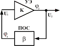 Здесь мы видим какой-то треугольник и прямоугольник. УЭ – это усилительный элемент с коэффициентом передачи К, а ПОС – это положительная обратная связь с коэффициентом передачи β. Колебания в этой системе возникнут только при соблюдении двух условий. Их надо запомнить: