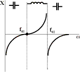 Особо не вдаваясь в подробности теории цепей, из рисунка 4 видно, что кварц может быть эквивалентом как последовательного колебательного контура, так и параллельного. Это также видно из рисунка 5. На частоте f01 происходит резонанс напряжений. Эта частота определяется по формуле: