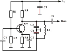 В этой схеме, аналогично предыдущей, режим по постоянному току определяют элементы R1, R2, R3, R4C2. В коллекторную цепь транзистора включен контур L1C3C4. Сигнал ПОС снимается с кондера С4 и через кондер С1 поступает в базовую цепь. С1 не пропускает высокое коллекторное напряжение на базу транзистора. Общую точку кондеров С3, С4 можно считать подключенной к источнику питания, поскольку его сопротивление переменному току незначительно.