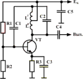 Элементы R1, R2, R3C3, как и в предыдущей схеме, обеспечивают режим работы по постоянному току транзистора VT, в коллекторную цепь которого включен колебательный контур L'L «C2. Выходной сигнал снимается с коллектора транзистора VT (или с L»), сигнал ПОС – с катушки L'. Поскольку напряжения этих сигналов противофазны, то автоматически выполняется условие баланса фаз. Сигнал ПОС подается на базу транзистора через разделительный кондер, сопротивление которого на частоте генерации мало. Этот кондер предотвращает попадание постоянной составляющей в базовую цепь (через катушку). Общая точка L' и L'' подключена к источнику питания, сопротивление которого переменному току незначительно. Условие баланса амплитуд выполняют подбором числа витков L'L''.