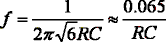 Работа начинается в момент включения источника питания. Возникающий при этом импульс коллекторного тока содержит широкий и непрерывный спектр частот, в котором обязательно будет и необходимая частота генерации. При этом колебания частоты, на которую настроена фазовращающая цепь, станут незатухающими. Для колебаний остальных частот условия самовозбуждения выполнятся не будут и они, соответственно, быстро затухают. Частота колебаний определяется по формуле: