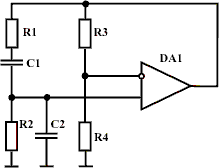 Левая часть этой конструкции представляет собой пассивный полосовой RC-фильтр, в точке А снимается выходное напряжение. Правая часть есть ни что иное, как частотно-независимый делитель. Принято считать, что R1=R2=R, C1=C2=C. Тогда резонансная частота будет определяться следующим выражением: