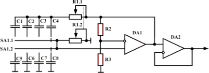 Итак, мост Вина образуют кондеры С1-С8, сдвоенный резик R1 и резики R2R3. Переключателем SA1 осуществляется выбор диапазона, резиком R1 – плавная регулировка в выбранном диапазоне. ОУ DA2 представляет собой повторитель напряжения для согласования с нагрузкой. В принципе, повторитель можно заменить усилителем, ксати на том же самом ОУ, ну а как это сделать, можно почитать