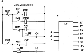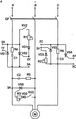 Силовая часть схемы состоит из группы тиристоров VS1…VS4, включенных встречно-параллельно в фазы Аи С. Между фазами Аи В включен короткозамыкающий тиристор VS5. Схема состоит из силовой цепи (рис. 1.33, а), цепи управления (рис. 1.33, б) и блока управления тиристорами – БУ (рис. 1.33, в).