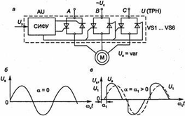 Схема тиристорного регулятора напряжения (а) и форма напряжения на статоре АД при различных значениях угла регулирования (б, в)