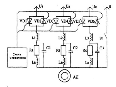 Для управления асинхронным двигателем могут использоваться тиристоры в сочетании с релейно-контакторными аппаратами. Тиристоры применяются в качестве силовых элементов и включаются в статорную цепь, релейно-контакторные аппараты включаются в цепь управления.