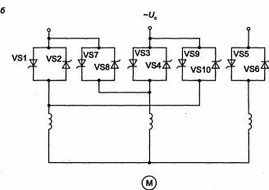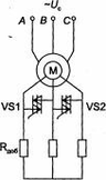 Используя тиристоры в качестве силовых коммутаторов, можно на статор при пуске подавать напряжение от нуля до номинального значения, ограничивать токи и моменты двигателя, осуществлять эффективное торможение либо шаговый режим работы. Такая схема приведена на рис. 1.33.