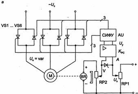 Функциональная схема замкнутой системы электропривода с АД и ТРН (а) и включение тиристоров для реверсивного управления (б)