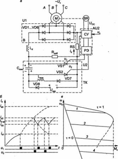 а – электрическая схема; б – временные диаграммы работы регулятора; в-механические характеристики в замкнутой системе