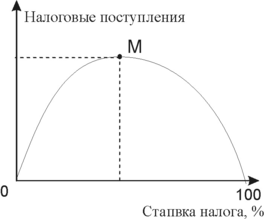 Согласно кривой А. Лаффера, увеличение налоговых ставок приводит к росту налоговых поступлений лишь до определенных пределов (точка М). Дальнейшее увеличение налоговой ставки приведет к чрезмерности налогового бремени. Оно ведет к уходу многих производителен с рынка из-за банкротств и к уклонению от налогов. Результатом указанных действий становится нежелательное уменьшение налоговых поступлений в казну.