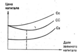 В свою очередь, взвешенная цена капитала зависит от цены его составляющих, обобщенно подразделяемых на два вида — собственный и заемный капитал. В зависимости от структуры капитала цена каждого из этих источников меняется, причем темпы изменения различны. Многочисленные исследования показали, что с ростом доли заемных средств в общей сумме источников долгосрочного капитала цена собственного капитала постоянно увеличивается возрастающими темпами, а цена заемного капитала, оставаясь сначала практически неизменной, затем тоже начинает возрастать. Поскольку цена заемного капитала (С3) в среднем ниже, чем цена собственного капитала (Сс), существует структура капитала, называемая оптимальной, при которой показатель СС имеет минимальное значение, а следовательно, цена предприятия будет максимальной.