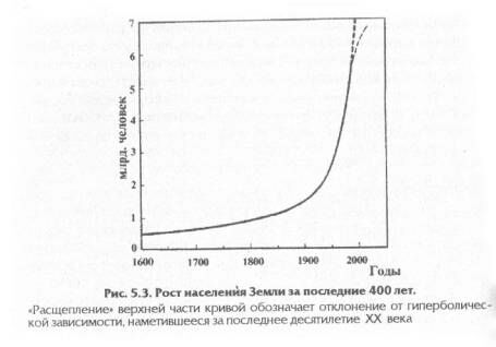 Особенности роста. На протяжении многих тысячелетий народонаселение мира росло чрезвычайно медленно. Считается, что к началу IV- го тысячелетия до н.э. оно составляло около 100 млн., к 1000 году н.э. едва достигало 300 млн., а к 1500 году увеличилось до 425 млн. Такие темпы соответствуют годовому приросту максимум до 0,7°/оо, т.е. до семи человек на 10000 за год. Начиная с эпохи Великих географических открытий темпы роста народонаселения заметно возросли и приблизились к экспоненциальной закономерности. Но затем нарастание числа людей на Земле, прослеженное уже на основании достаточно достоверных исторических данных, приобрело еще более необычный характер, стало гиперболическим. В период с 1600 по 1990 гг. рост населения Земли довольно точно (с максимальным отклонением с5%) описывается эмпирическим уравнением гиперболы (рис. 5.3):