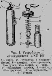 Огнетушитель ОХП-10 (рис. 1). Для хранения кислотной части заряда в этом огнетушителе применен стакан, закрываемый подвижной резиновой пробкой