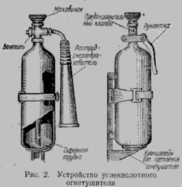 роме ОУ-2 промышленность выпускает огнетушители с баллонами большей емкости: ОУ-5 (0,005 м3) и ОУ-8 (0,008 м3), а также перевозные или стационарно устанавливаемые, каждый баллон которых имеет емкость 0,04 м3. Перевозные огнетушители монтируют на тележках. Принцип действия и устройство указанных углекислотных огнетушителей аналогичны огнетушителю ОУ-2.