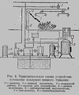 Стационарные установки воздушно-пенного тушения (рис. 8) применяют для защиты складов, производств, связанных с применением или переработкой нефти и нефтепродуктов, находящихся резервуарах, закалочных ваннах, технологических аппаратах и других хранилищах.