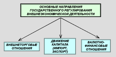 Основные направления, формы и методы государственного регулирования внешнеэкономической деятельности. Одной из важнейших тенденций в развитии мировых хозяйственных связей является диверсификация форм сотрудничества. К традиционным формам ВЭО обычно относят внешнюю торговлю и инвестиционное сотрудничество, связанное с перемещением финансовых потоков в виде экспорта и импорта капитала. Научно-техническое сотрудничество и промышленная кооперация выделяется либо в рамках последнего направления, либо как самостоятельные формы. Еще одной формой ВЭО, представляющий интерес с точки зрения государственного регулирования являются валютно-финансовые отношения. Таким образом, говоря о системе внешнеэкономических отношений в целом, можно выделить следующие основные направления их государственного регулирования: внешнеторговые, инвестиционные, связанные с экспортно-импортными потоками капиталов (включающие научно-техническое сотрудничество и промышленную кооперацию) и валютно-финансовые.