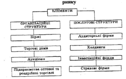 1) організаційно-технічну інфраструктуру (товарні біржі й аукціони, торгові доми й торгові палати, холдингові й брокерські компанії, інформаційні центри та ярмарки, сервісні центри, пункти прокату й лізингу, державні інспекції, різного роду асоціації підприємців і споживачів, транспортні комунікації і засоби оперативного зв'язку.