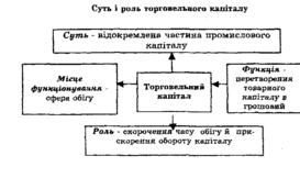 Отже, сутність тоговельного капіталу полягає в тому, що він, по-перше виступає як відокремлена частина промислового капіталу і, по-друге, він займається не просто реалізацією товарів, а перетворенням товарного капітану в грошовий.