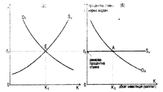 В лекції розглядається проста модель ринку капіталу, а саме - модель ринку позичкових коштів. Учасниками цього ринку є фірми, які формують інвестиційний попит на позичкові кошти dk, що необхідні для створення нового капіталу, а також домогосподарства, які формують пропозицію позичкових коштів sk, тобто пропозицію фінансових ресурсів за рахунок власних заощаджень (puc.la). На цьому ринку (який розглядатиметься лише в умовах досконалої конкуренції) утворюється ринкова процентна ставка re як рівноважна ціна позичкових коштів та рівноважний обсяг позичкових коштів Ке